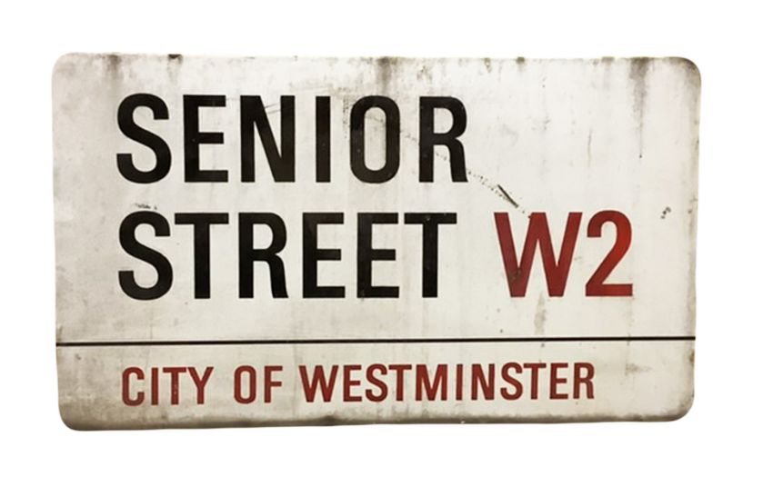 An enamelled steel street sign for Senior Street W2, City of Westminster