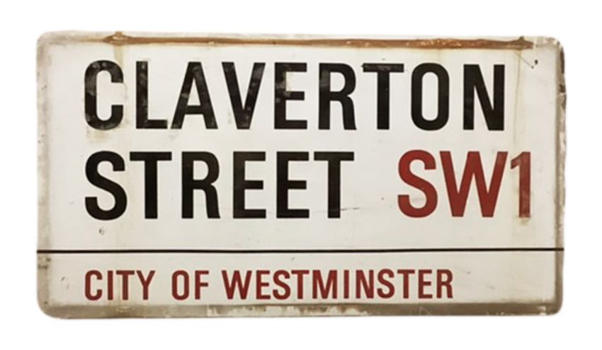 An enamelled steel street sign for Claverton Street SW1, City of Westminster with iconic black and red sans serif lettering first created by Sir Misha Black in 1967 which is unique to the Westminster signs and under copyright law, forbidden to be copied anywhere else in the world, sold together with a signed Certificate of Authenticity