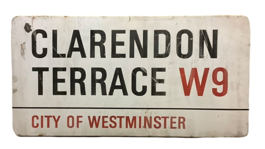 An enamelled steel street sign for Clarendon Terrace W9, City of Westminster with iconic black and red sans serif lettering first created by Sir Misha Black in 1967 which is unique to the Westminster signs and under copyright law, forbidden to be copied anywhere else in the world, sold together with a signed Certificate of Authenticity