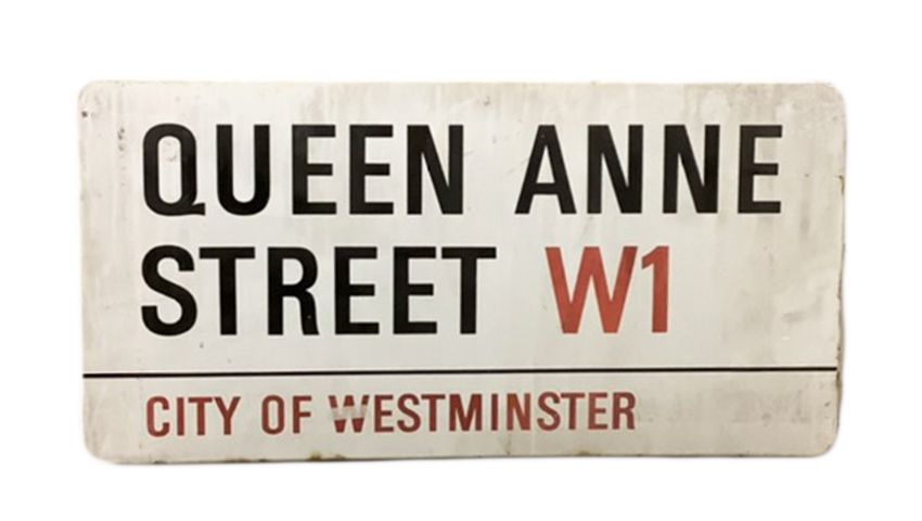 An enamelled steel street sign for Queen Anne Street W1, City of Westminster with iconic black and red sans serif lettering first created by Sir Misha Black in 1967 which is unique to the Westminster signs and under copyright law, forbidden to be copied anywhere else in the world, sold together with a signed Certificate of Authenticity