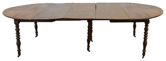 the drop flap top with rounded ends and extending to include three leaf insertions, on baluster turned legs ending in wooden castors, with two extra matching supporting legs