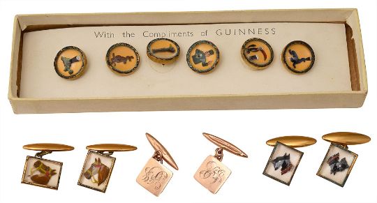 first square fronts engraved with initials with chain with chain links and torpedo backs, together with a boxed set of six Guinness advertising waistcoat buttons and two pairs of Essex crystal style horse and dog cufflinks, (4)