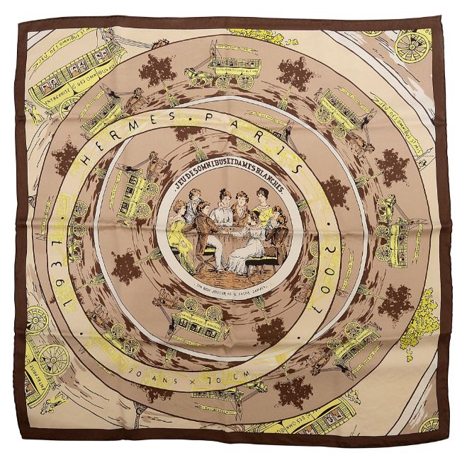 a reissue of the first Hermes scarf design by Hugo Grygkar, printed images of omnibus's and seated Regency figures, in yellow, beige and browns, completed with original box