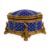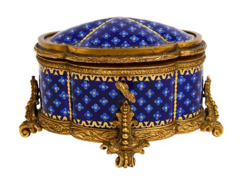 of quatrefoil outline with hinged domed lid, cobalt blue ground enamel decorated with translucent flowerheads with gilt borders, the foliate cast mounts on scroll feet, silk lined key present
