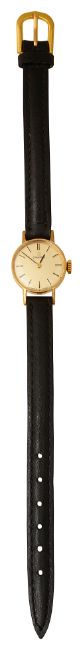 circular champagne dial with raised gilt hour batons, 17 jewels cal 485 movement, leather bracelet