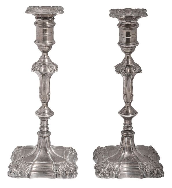 knopped columns, shell shoulders, spool shaped capitals, detachable drip pans, on raised shaped square bases with shell corners, weighted bases, (2)