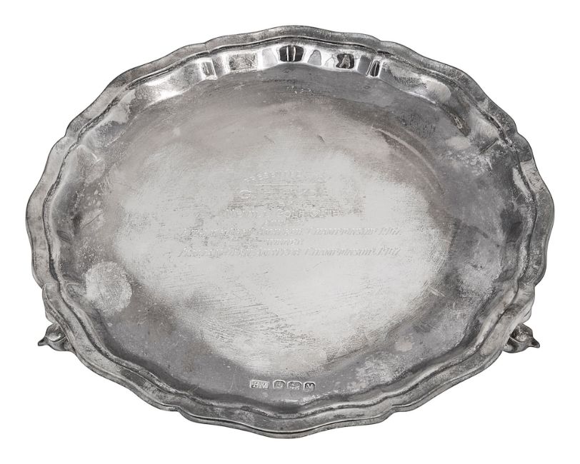 plain circular form with piecrust border, on scroll feet, engraved with presentation inscription,