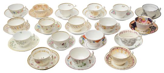 London shape, to include a Coalport example painted with trailing red currants, a Coalport type blue ground cup painted with flowers, two Spode moulded teacups and saucers decorated in pattern 3448, two Spode tea cups and saucers decorated in pattern 3989, a Thomas Wolfe & Co tea cup bat printed with a pastoral scene with shepherdess and a boy playing the pipe under a tree, a Coalport John Rose & Co 'feltspar porcelain' example, a Ridgway cup and saucer decorated in pattern 2/437 and others to include Coalport examples with floral decoration, (18)