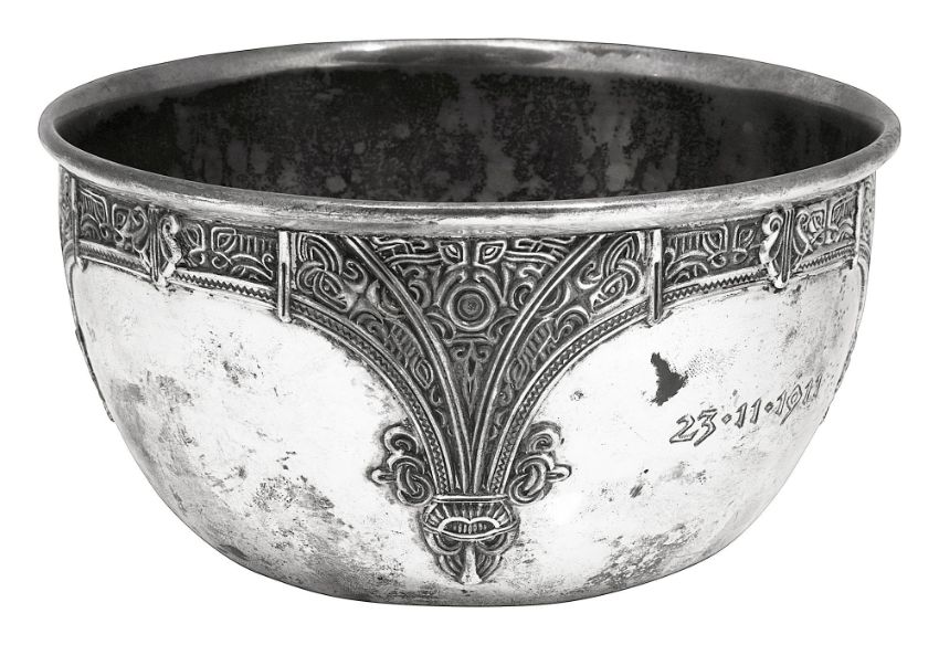 of circular tapering form, decorated with an applied arcade of Norse strapwork, engraved with monogram and date 23.11.1911