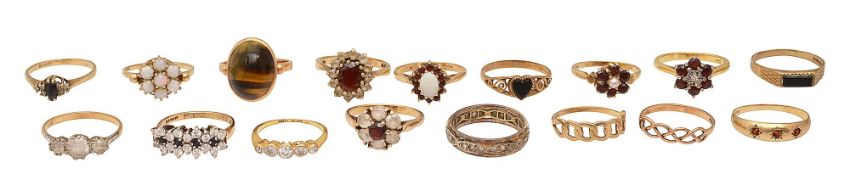 including a 9ct gold diamond and sapphire floral cluster ring, stamped '9.375', a five stone diamond ring marked 'PLAT', a 9ct gold garnet and diamond cluster ring stamped '9c', 9ct gold garnet and colourless paste set cluster ring stamped '375', 9ct gold garnet and seed pearl cluster ring stamped '9.375', 9ct gold garnet and opal set cluster ring stamped '375', 9ct gold opal set cluster ring stamped 'S&K 375', garnet and colourless paste ring, a colourless paste eternity ring and various 9ct gold rings all variously stamped (17)