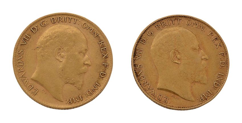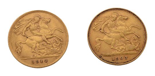 dated 1903, bald head facing right, George slaying the dragon to reverse, together with a Edward VII half sovereign, dated 1910, bald head facing right, George slaying the dragon to the reverse (2)