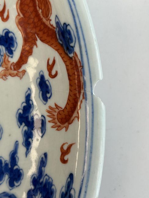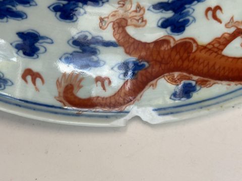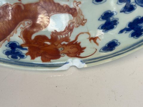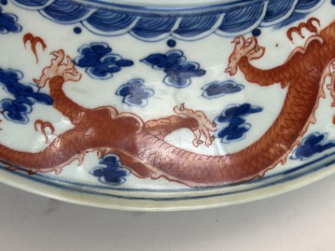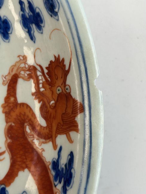 A late 19th century Chinese blue, white and iron red porcelain dragon dish