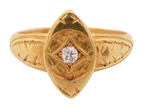 the central navette-shaped plaque centrally-set with an old brilliant-cut diamond within a star motif, to the engraved surround and shoulders, the shank stamped '18'