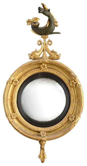 Condition: The mirror plate is original has some light foxing. Regilt. Minor losses to gesso in several places, gilt original with some light rubbing. Crack to pendant drop. Original back boards. Later piece of timber added behind hippocampus to reinforce crest