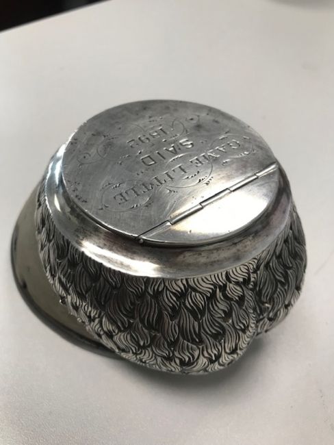 Edinburgh, 1895, maker's stamp 'WB', the hinged lid inscribed, 'Game Little "Said" 1892', the silver hair collar extending round the back, on an iron shoe