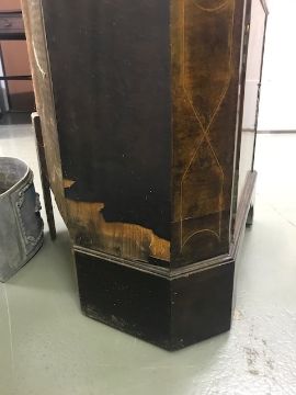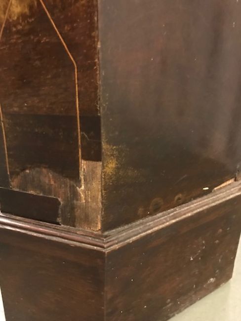 Condition: Two glass panes are cracked. There are noticeable veneer losses to the lower corners of the base. See images.