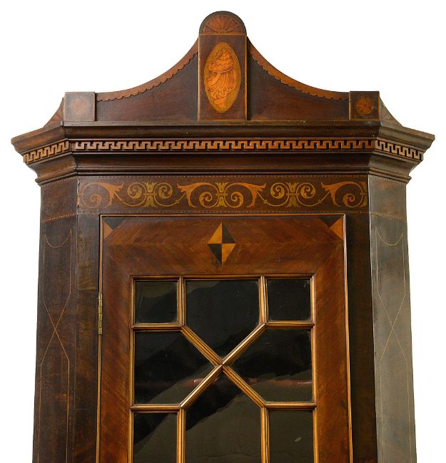 in one piece, with some later inlay, the later cornice with shell inlay and above a dentil cut frieze, the twin panel multi glazed door above a lower shell inlaid cupboard door, on bracket feet
