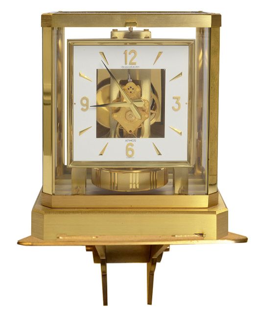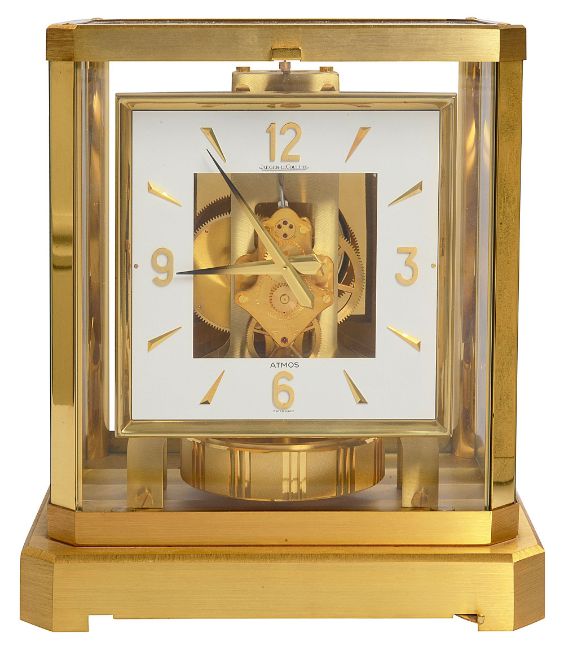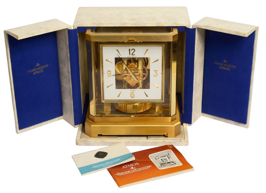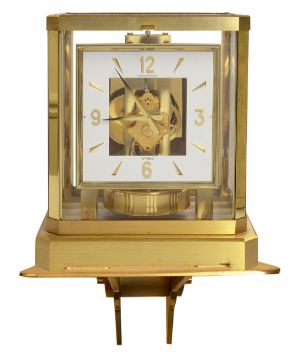 A Jaeger Le-Coultre Atmos VIII bracket clock, no. 315327 and wall bracketsquare white dial with gilt Arabic quarter numerals and dagger hour markers, CAL528-8, skeleton movement, brushed brass five glass case on an oblong base, with original booklets and fitted outer case, accompanied by a Jaeger Le-Coultre brushed brass wall bracket, (2)height 23.4 cm., width 21c m., depth 16.5cm.Condition: Good condition. the clock has been set up on a level surface. Initially the clock does work and runs, however it does later stop. We are unable to offer any guarantee as to the full working order of this clock and would recommend that it is serviced.