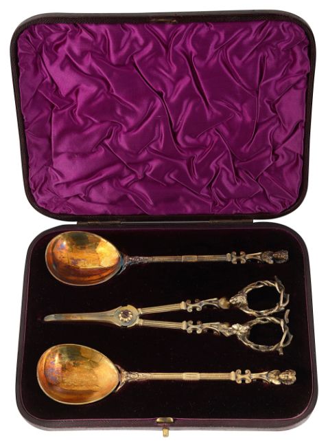 A late Victorian cased silver-gilt set of grape shears and serving spoons