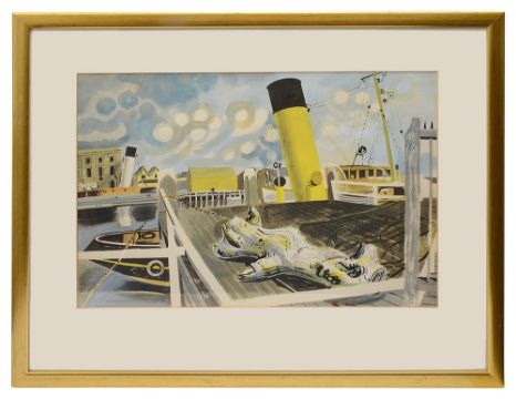 'Tug Pier, New Haven', gouache, signed lower left, mounted and framed