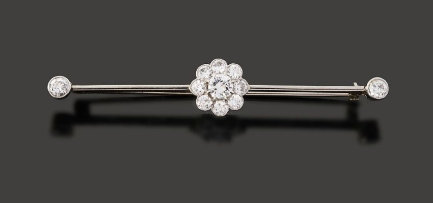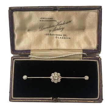 the central flowerhead cluster and collet terminals set with brilliant-cut diamonds, the bar engraved 'PLAT & 18ct', contemporary leather and gilt tooled fitted case for Davidson, Henderson and Sorley, Glasgow