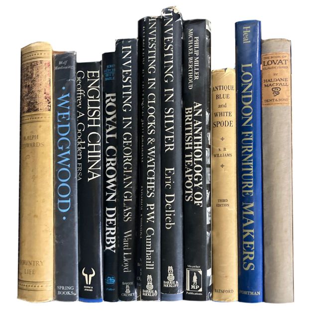 to include Macfall Haldane, The Book of Lovat, Claud Fraser, 1923 Dent, pictorial boards, cloth spine, a Mallett & Son catalogue c.1930, Edwards Ralph, The Shorter Dictionary of English Furniture, 1964, Mankowitz, Wedgwood, 1972, Godde, English China, 1985, Twitchett & Bailey, Royal Crown Derby, 1976, Lloyd, Investing in Georgian Glass, 1969, Falkiner Inversting in Antique Jewellery, 1968, Cumhaill, Investing in Clocks and Watches, 1967, Delieb, Investing in Silver, 1968, Haslam, English Art Pottery 1865-1915, 1975, Williams, Blue and White Spode, 1949, The Concise Encyclopaedia of Antiques compiled by The Connoisseur, 1954-1961, Miller & Berthoud, An Anthology of British Teapots, Heal, London Furniture Makers, 1988, etc., (qty)