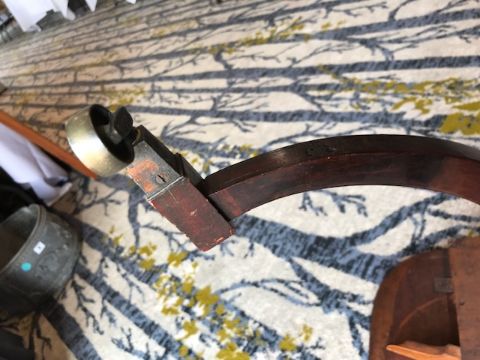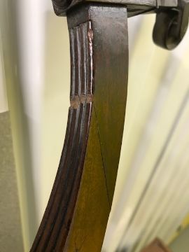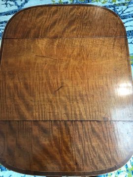 Condition: Good overall restored condition. There are old professional repairs to the lower sections of two of the legs, towards the feet. See images. Some old scratches to the centre of the top. There is a minor area of loss to the stringing near a hinge.