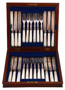 A late Victorian cased set of twelve mother of pearl handled fruit knives and forks and a set of six pistol grip handled table knives