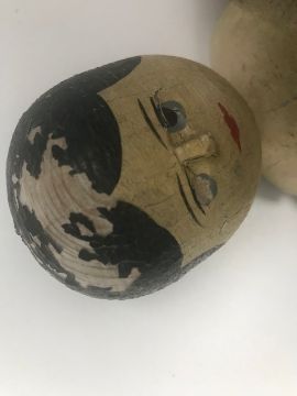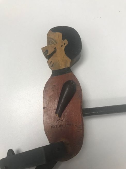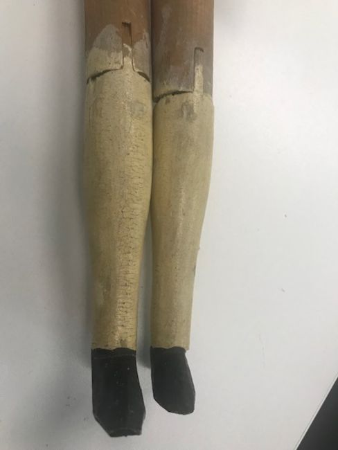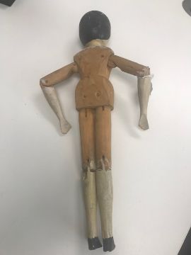 A Grodnertal pine and painted pegged dolllate 19th centurypine and with cream painted arms, legs and face, together with a painted wood dancing jig toy, early 20th century, body impressed, 'PAT No 7725', (2)Doll height approx. 43cmCondition: There are noticeable paint losses to the head and one eye has lost its colour, the paint is also crazed, see image. Paint to legs and arms a little crazed as well. Small timber loss to rear of left lower leg. The jig toy has a broken arm, piece present. One foot is later and one lower legs section is replaced.