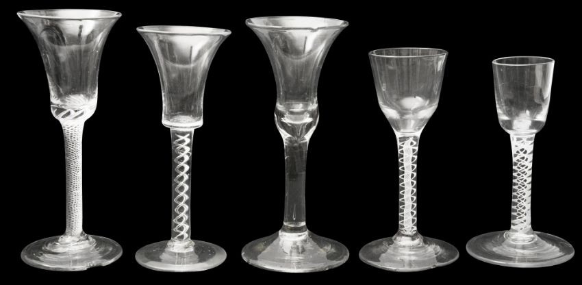 Five 18th century wine and cordial glassescomprising a glass with bell shaped bowl on a mercury twist stem, a multi spiral air twist glass with bell shaped bowl, glass with bell shaped bowl and basal tear on plain stem with tear, an opaque twist double series cordial glasses, both with funnel shaped bowls, one with a central gauze corkscrew and a pair of outer thread, the other smaller example a pair of spiral threads and multiple spiral tapes outside, (5)first height 16.1cm.Condition: First foot has been reduced, evidence of being ground to underside. Multi spiral air twist with a chip to foot rim Plain stem with basal tear has a small chip to rim and several fleabites to foot Larger cordial glass with grind to foot edge and fleabite Smaller cordial glass with chips to foot edge and underside and rim has been ground