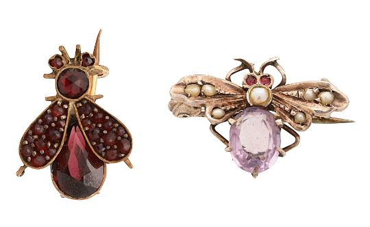 Two late 19th/early 20th century gem-set insect brooches: the first set throughout with garnets; the second with an amethyst abdomen, half pearl thorax and outstretched wingsthe first 1.4cm long, the second 2.0 cm wide, combined gross weight 3.5gCondition: Overall condition good.Garnet setting tests as gilt; amethyst setting tests as silver
