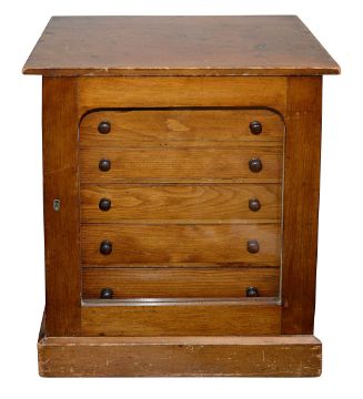 arched glazed door enclosing six graduated long drawers with turned knob handles, on plinth base