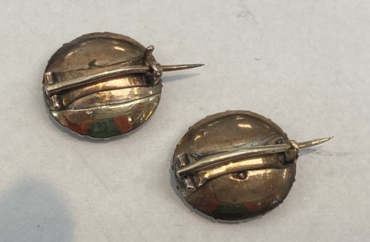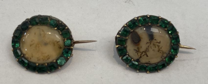 each oval moss agate plaque within a surround of square-cut bright green paste (one replacement), closed back yellow gold setting (brooch fittings later)