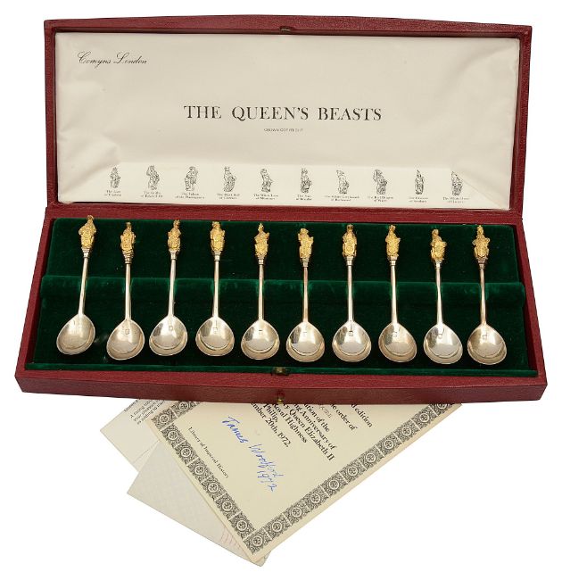 A cased set of ten silver-gilt 'Queen's Beasts' teaspoons