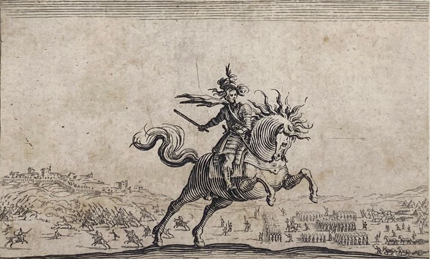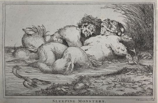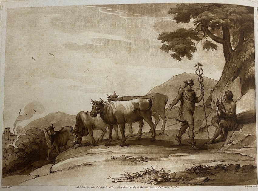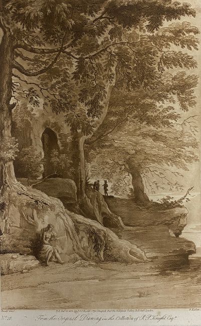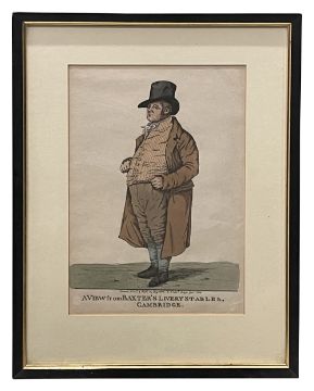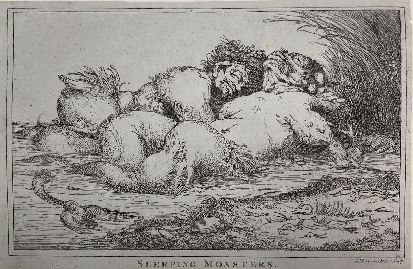 including Richard Dighton (1752-1814) 'A View from Baxter's Livery Stables, Cambridge' etching with hand colouring, titled beneath image and inscribed 'Drawn, etch, & Pub By Dighton, 6. Char. Crofs, Jan 1810'; John Hamilton Mortimer (1740-1779) 'Sleeping Monsters', etching, titled below image, inscribed 'I. Mortimer Del et Sculp'; Jacob Gillberg (1724-1793) 'Paysage au bord d'une riviere' stipple engraving and etching in red ink, inscribed to lower right 'J Gillberg sculp'; 'A rider on horse back', trimmed etching and a set of three folio aquatints from the original drawing in the collection of R.P. Knight Esq No. 16, No. 31 and No. 37 (7)