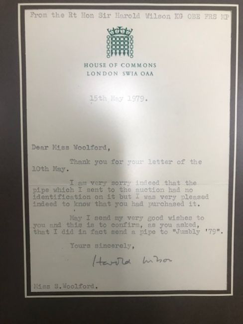 The pipe was bought by the present owner in a charity auction at Alexandra Palace in 1979. Miss Woolford then wrote to Sir Harold Wilson later that year for confirmation of ownership.