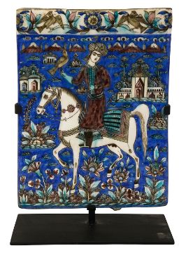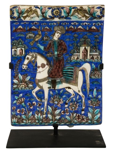 rectangular moulded in relief with a nobleman on horseback holding a falcon in a landscape with buildings mountains and flowers, painted in blue, black and manganese, mounted on a contemporary metal display stand