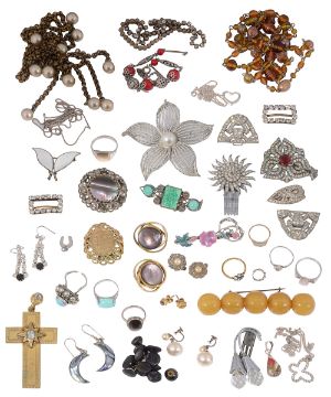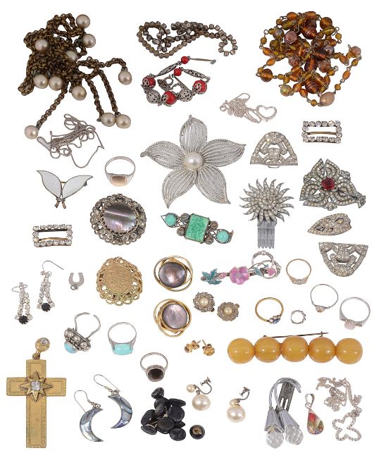 to include a 9ct three stone dress ring, Norwegian David Andersen silver and enamel leaf brooch, a 19th century gilt metal paste cross pendant, silver and enamel bar brooch a simulated pearl fringe necklace, Neiger Peking glass with Chinese characters, etc, (qty)