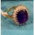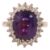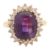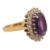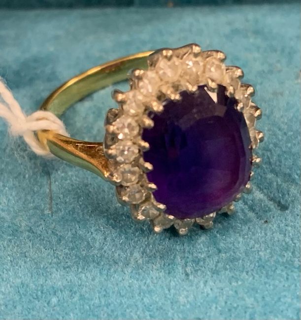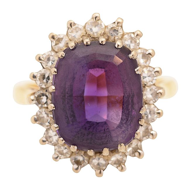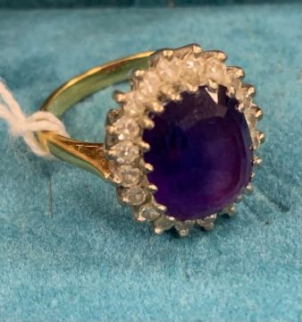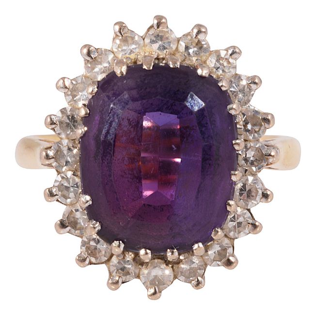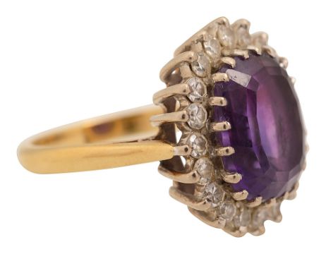 the oval mixed-cut amethyst claw-set above a border of single-cut diamonds to the plain tapering shank stamped '18ct'