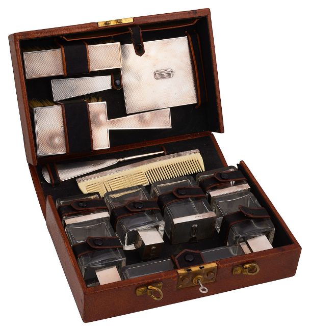 A George V Art Deco design pigskin cased silver travelling dressing set