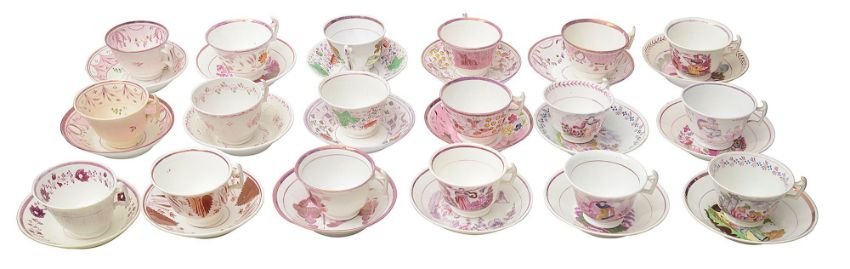 A collection of early to mid 19th century pink lustre ware teacups and saucers
