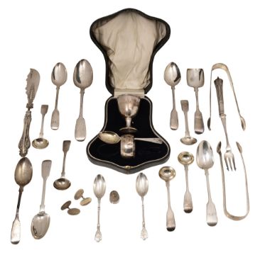 first an egg cup, napkin interior gilt , and spoon London, 1902, Robert Pringle & Sons, initialled, together with two pairs of sugar tongs, a pair of George IV fiddle pattern salts spoons, London, 1828, Clement Cheese, initialled, A William IV pair of fiddle pattern salts spoons, assorted Victorian fiddle pattern teaspoons, A Victorian butter knife with filled handle a/f, a thimble, a pair of engine turned oval chain back 9ct on silver cufflinks etc. and four similar Victorian silver dessert spoons, London, one monogrammed (Qty)