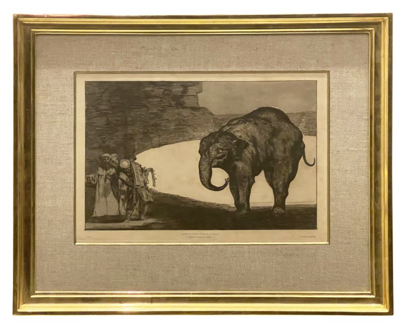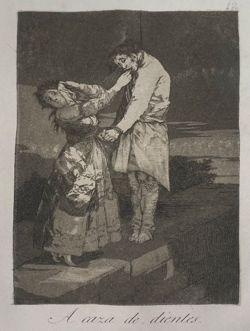 Francisco Jose de Goya (Spanish, 1746-1828)A group of three prints including: 'Otras Leyes por el pueblo' from the series 'Los Disparates', aquatint with etching and dry point, titled below image, inscribed lower left 'Goya inv. et. sc.', later edition; 'A caza de dientes' from the series 'Los Caprichos', aquatint and etching, plate number 12, titled below image; 'Las Resultas', from the series 'Los desasrtes de la guerra', etching, plate 72, inscribed top left '72', titled below image. (3)plate size (illustrated):212 x 325mm, framed sized 42.7 x 52.2cm Condition: Otras Leyes por el pueblo' - light foxing to the surface of the paper, but otherwise in good overall condition.A caza de dientes - In good overall condition Las resultas - in good overall condition.