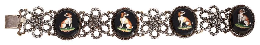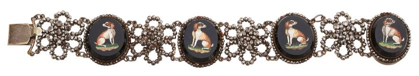 An early/mid 19th century micro-mosaic and cut steel braceletthe four oval onyx plaques each depicting in micro mosaic a stylised King Charles spaniels,within a faceted cut steel border, with flowerhead openwork cut steel connections, plated base metal reverse approx length 18cm, 42.4gCondition: Overall condition good/very good, commensurate with age.A few very minor chips to the onyx