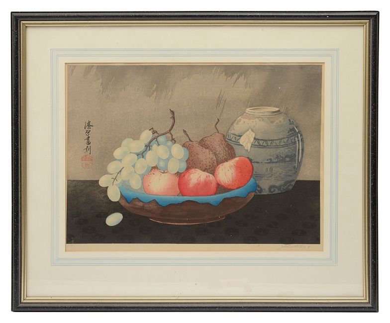 'Still life of fruit in a bowl and a ginger jar', a woodblock print, numbered in No71 lower right and signed lower left in pencil, bears red seal mark, framed