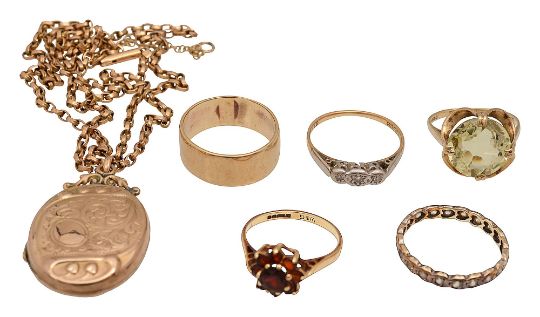 including a 9ct gold band marked '9.375', a 9ct cased locket marked '9ct back & front' suspended on a chain marked '9c' to clasp, a citrine set 9ct gold ring, stamped '9.375', a garnet cluster set 9ct gold ring, stamped '9.375', a colourless paste eternity ring, a three stone diamond set 18ct gold and platinum ring stamped '18ct & Plat' (6)