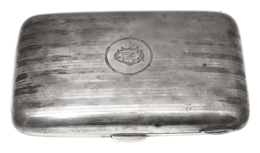 curved rectangular form with linear engine turned decoration, interior gilt, circular reserve initialled,