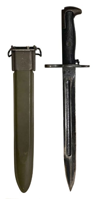 9 3/4 " blade stamped PAL US between shell and flame ordnance mark to the ricasso, green fibreglass scabbard marked VP 25 with belt clip