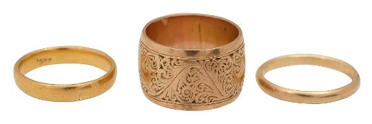 including one wedding band marked '22c', 9ct gold wedding band stamped '9.375' and 9ct gold ring with chased scrolling foliate design stamped '9.375' (3)