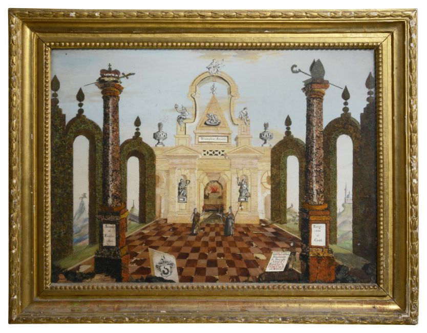Inscribed to image 'Religi one et cura / Scientia et foritus dine / Gavde laetare fan lonla / In Georgio carlo I, Francis CVS LVDoVICVS / II revivis Cet. '